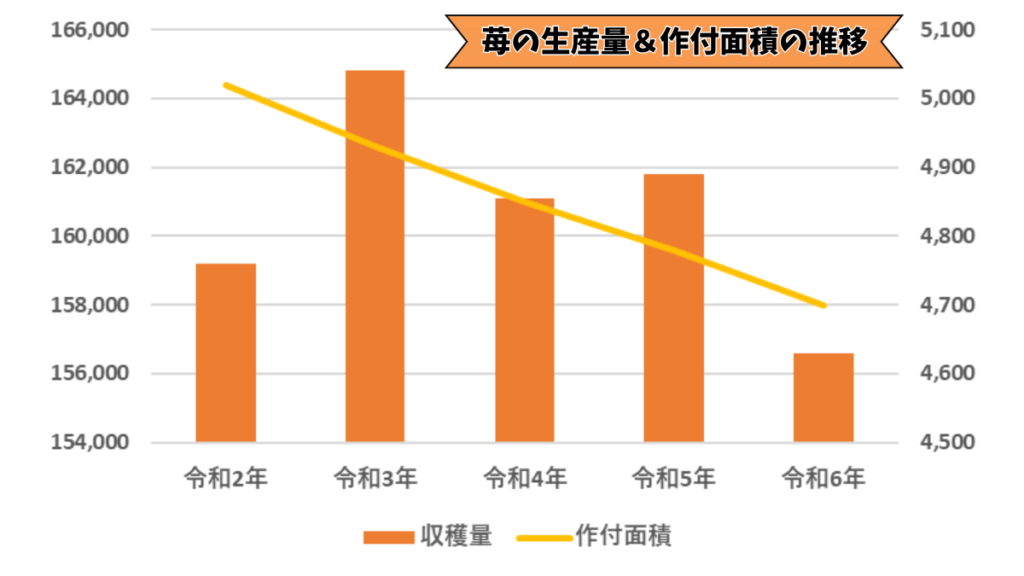 いちごの生産量と作付面積の推移を見てみると、過去5年間で令和6年は最低の生産量であり作付面積も年々減少しています。